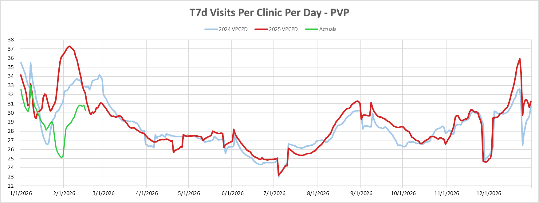 After a significant increase in visit volume from 29 to 36 visits per clinic per date in December, we’ve seen a sharp decrease in urgent care visits. As of mid-February, the 7-day rolling average 30 visits per visit per day. Last year, urgent care visits spiked from late January through mid-February, directly contrasting what we’re seeing in 2026.